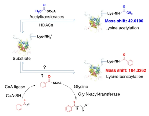 ①作用机制:一种新发现的含有苯环的酰化修饰,主要发生在组蛋白的N末端尾部。苯甲酸钠(SB)可以在哺乳动物细胞中转化为苯甲酰辅酶A,这是赖氨酸苯甲酰化(Kbz)的前体,也是降解细菌和肠道微生物中许多芳香族生长底物的中心中间体。它具有与组蛋白乙酰化不同的生理相关性。